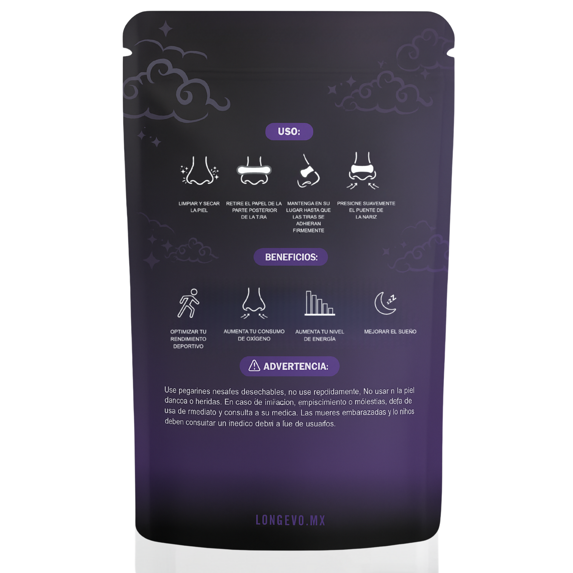 Las tiras nasales Longevo® desbloquean el poder de tu respiración nocturna. Al abrir suavemente tus fosas nasales, permiten una entrada de oxígeno más libre y constante, ayudándote a alcanzar fases REM más profundas y un descanso realmente reparador.